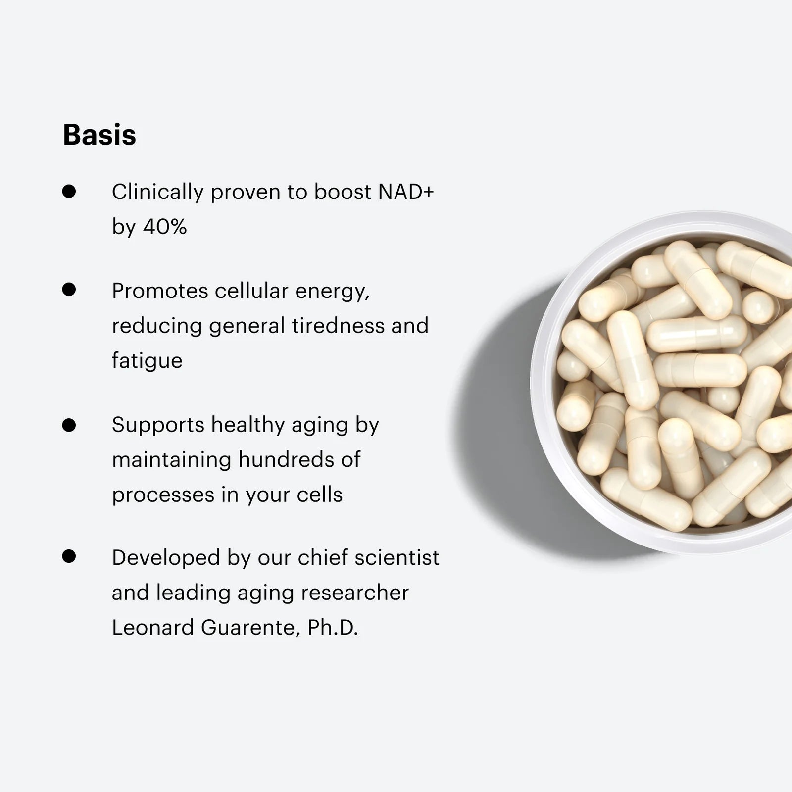 Target aging at the source—your cells. Increase your NAD+ levels with Basis for healthy aging, to boost cellular energy, and maintain healthy DNA. Developed by Elysium chief scientist and renowned aging researcher Leonard Guarente, Ph.D. Increase and sustain NAD+ levels by 40% to: